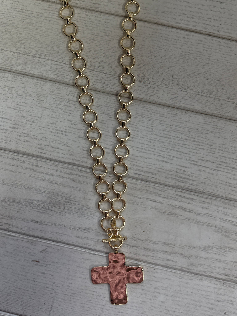 Shiny Gold Open Toggle Chain With Hammered Gold Cross 17” Necklace